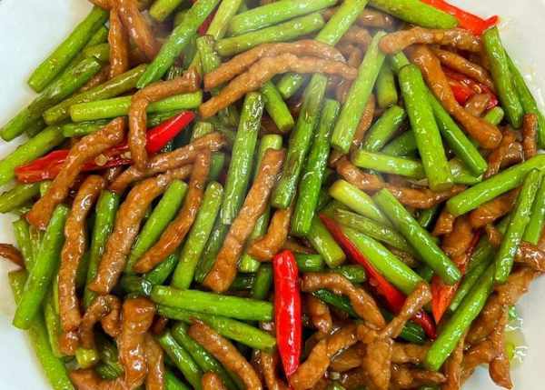 4.最後再倒入肉絲一起翻炒均勻,淋入適量的蠔油提鮮,繼續翻炒均勻入味,即可出鍋開吃。
