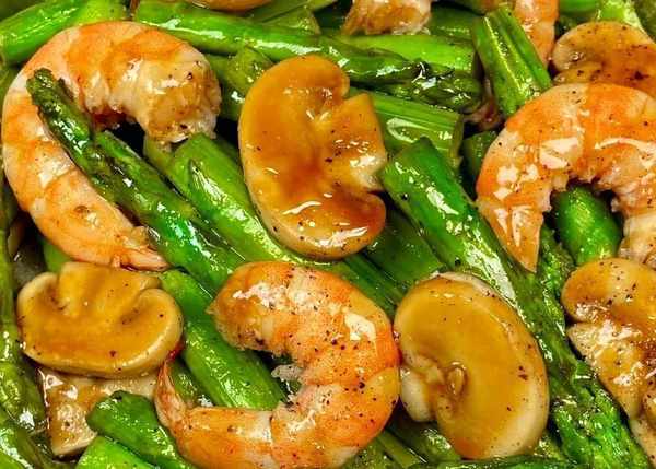 食材準備:大蝦、口蘑、蘆筍、蒜末、黑胡椒粉。