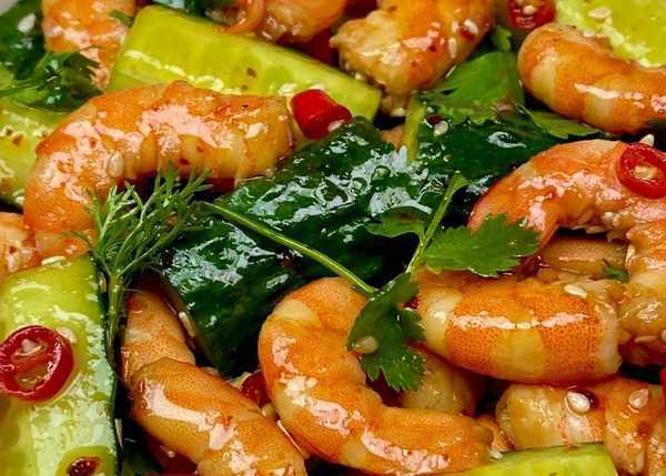 食材準備:大蝦、黃瓜、香菜、小米辣、蒜末、白芝麻、辣椒面