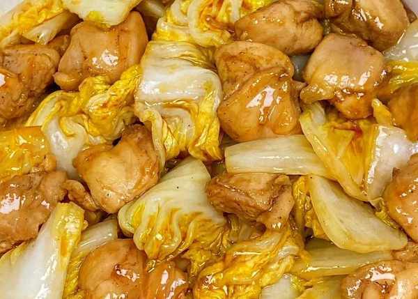 2.清洗幹凈娃娃菜,接著切成小塊,然後熱鍋燒油,油熱以後,放入醃制好的雞腿肉煸炒,煸炒至雞腿肉變色後,盛出備用。