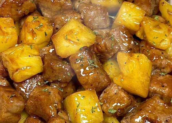 食材準備:菠蘿、牛肉、黑胡椒粉、歐芹碎。