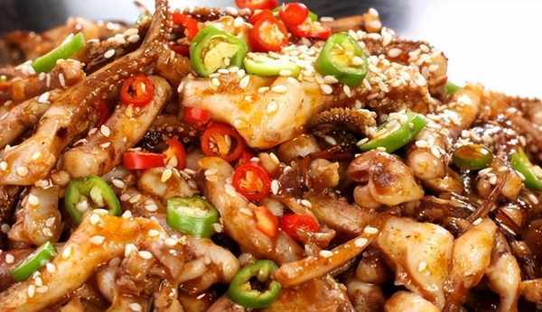 材料:魷魚:500克、青椒:1個、紅椒:1個、幹辣椒:10個、豆瓣醬:適量、料酒:適量、鹽:適量、雞精:適量、生抽:適量、蠔油:適量、糖:適量