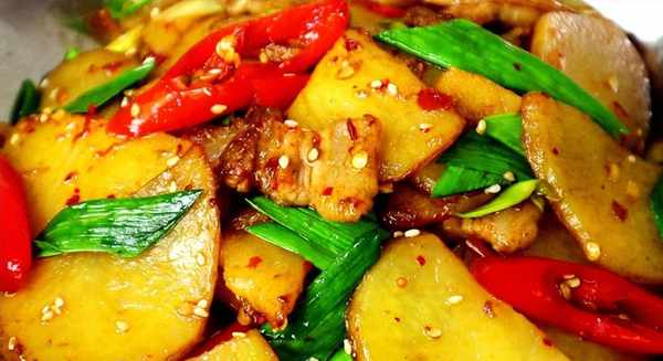 材料:土豆:500克、瘦肉(切片):200克、大蔥:1根、蒜:5瓣、幹辣椒:10個、豆瓣醬:適量、料酒:適量、鹽:雞精:適量、生抽:適量、糖:適量、植物油:適量