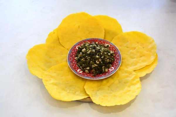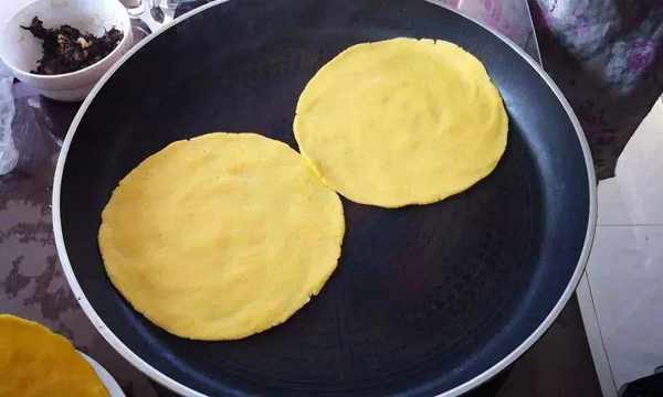 將玉米曬幹磨粉和成面團,攤薄加熱就成瞭餅。外焦裡嫩,還可以隨意抹上豆腐乳或夾上咸菜豆腐,簡單卻實在。