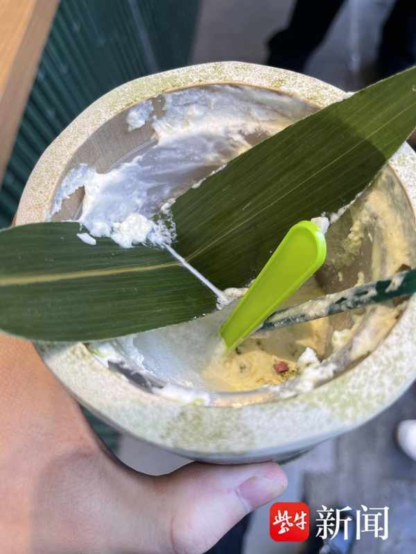 再次步行約300米,記者來到第二傢竹筒奶茶店。與第一傢店一樣,竹筒的內部加裝瞭一個一次性塑料杯,但塑料杯的尺寸與竹筒之間存在著差異,並不能完全吻合,導致會有一些“蓋頂”的奶油直接與竹筒接觸。