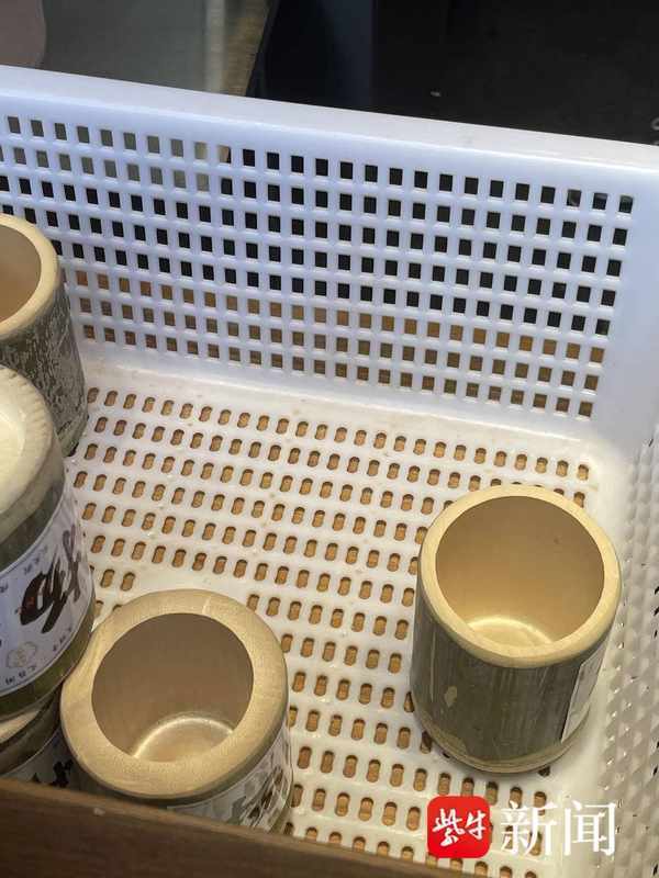 在店鋪的點單機旁,放著一模一樣的白色塑料框,裡面裝著等待使用的空竹筒。記者在店內未發現有任何消毒設備,這些“擦洗”過的竹筒是否進行瞭消毒,不得而知。