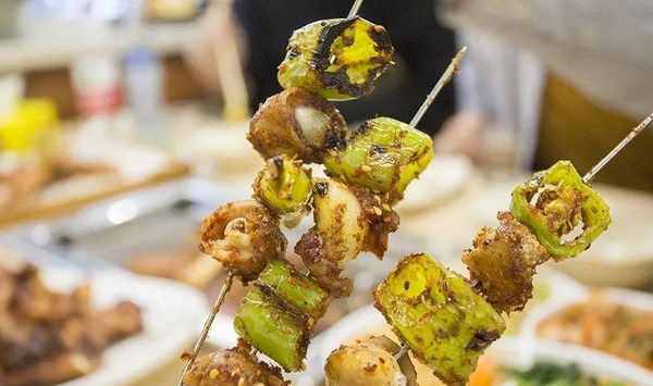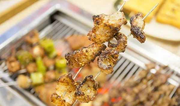 還有另外一個“烤肥腸”我們覺得也不錯!燒烤店的肥腸也挺常見,這傢不同的是每個肥腸圈中間,都夾瞭一粒大蒜。然後肥腸和辣椒圈搭配在一起吃