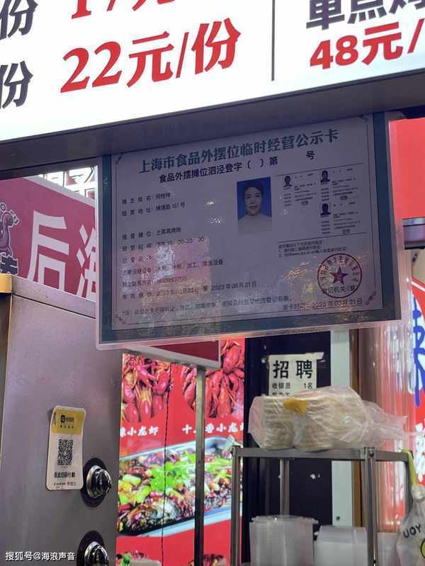 在外擺攤位上,一些攤鋪上貼著上海市食品外擺位臨時經營公示卡,上面註明攤主姓名、經營者照片、經營攤位品類、主要設施設備等內容,還註明此卡不得轉讓、塗改,如需變更、更換及時至管理方登記備案。發卡時間為2023年3月21日。