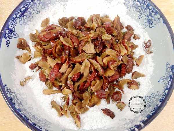 2、準備少許糯米粉,將煮好的紅棗和洗凈的葡萄幹倒入糯米粉中,攪拌均勻。