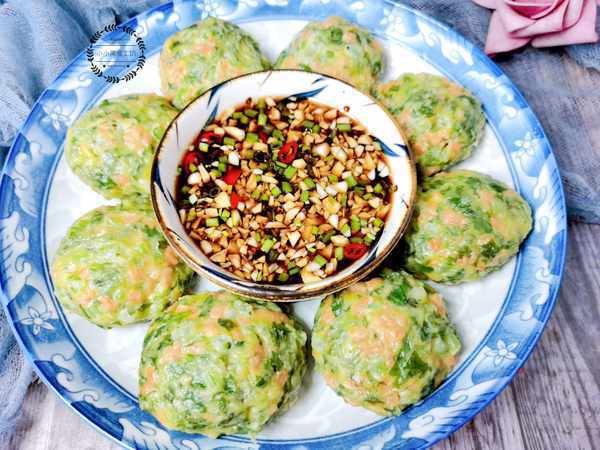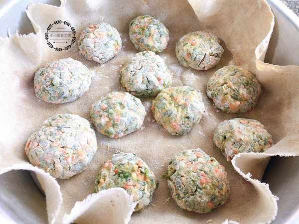 3、接著將茼蒿菜團揪出一塊,團成小餅的形狀放入蒸屜中大火蒸制15分鐘即可。