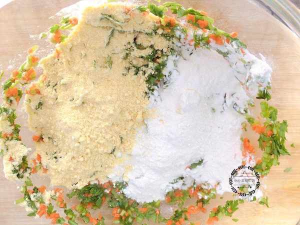 1、將茼蒿和胡蘿卜清洗幹凈,然後切碎放入盆中,打入2個雞蛋,適量的食鹽,胡椒粉和蠔油攪拌均勻。