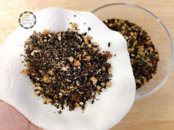 3、將面劑按壓成面皮,包裹住做好的芝麻紅糖餡,然後封口包裹緊實。