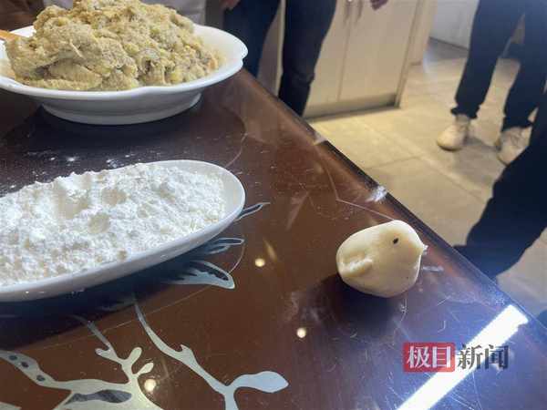 極目新聞記者在現場看到,丘大師捏出來的每一個面團幾乎都是一樣大小,稱重均為2克左右。在點心開酥環節,隻見丘大師一隻手搟面,一隻手卷皮,左右手同時開工,動作一氣呵成,不過一兩秒鐘的時間,一隻點心就“開酥”完成。丘大師還“就地利用”工具,僅使用兩隻勺子、兩顆黑芝麻就捏出一隻栩栩如生的小雞。據介紹,丘大師曾經在多次宴會場所,現場制作出12生肖的象形點心。