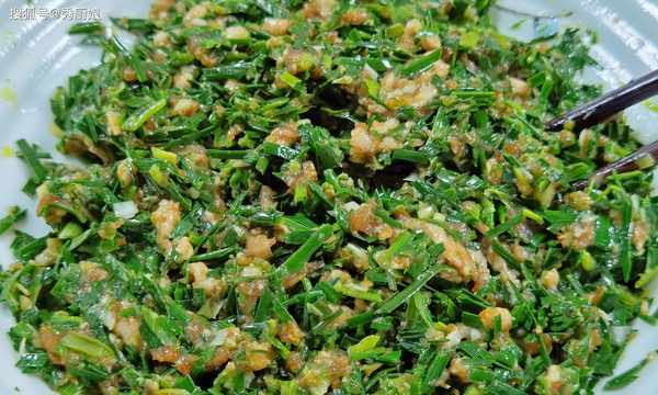 3.盆內加入適量的五花肉餡,加入適量的料酒和生薑末,加鹽、生抽、香油,攪拌均勻後,醃制15分鐘,然後將鴉蔥和五花肉餡,放在一起,加鹽和食用油攪拌均勻,調成菜餡。