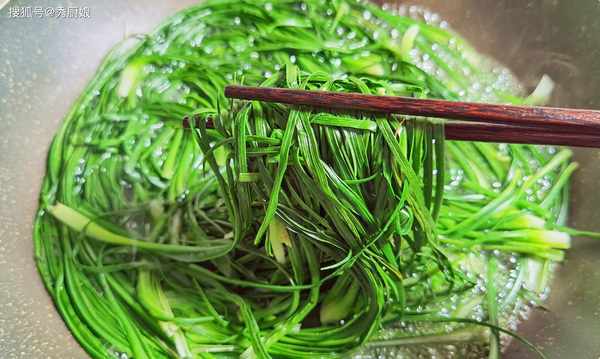 2.將鴉蔥洗凈,去掉根部,註意根部不要丟掉,可以留著蘸醬吃。鍋內加水燒開,放入鴉蔥,焯水2分鐘後,將鴉蔥撈出,放入盛有涼水的盆內過涼,然後擠幹水分,切成小段,裝入盆中。