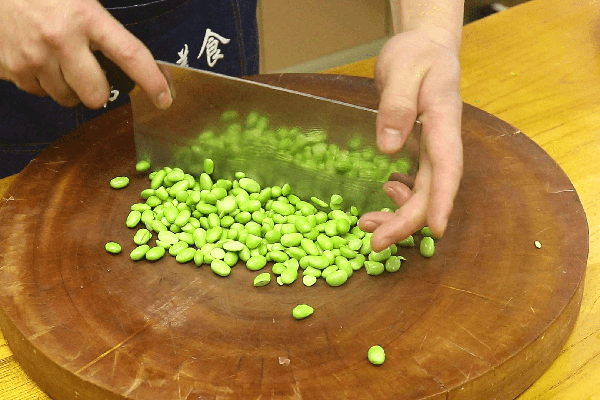 再準備一碗毛豆,用刀軋碎,也不要太碎。留一些粗顆粒在裡面,吃起來更有滋味。切好以後放入盆中,打入兩個雞蛋,加入食鹽、味精、十三香、少來一點胡椒粉。