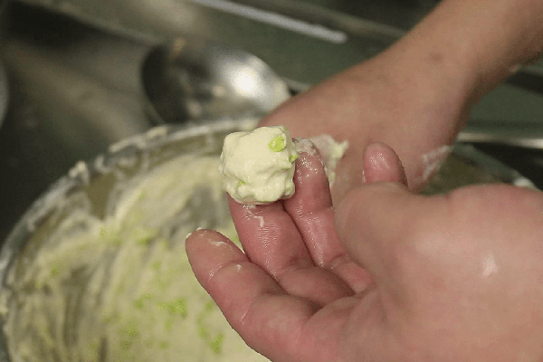 3.湯汁燒開以後,我們開始下毛豆丸子。抓一把餡料,在虎口處擠成丸子放入鍋中。水不要過於沸騰,讓丸子在鍋中慢慢定型。下丸子的時候要經常搖晃鍋,以免糊底。