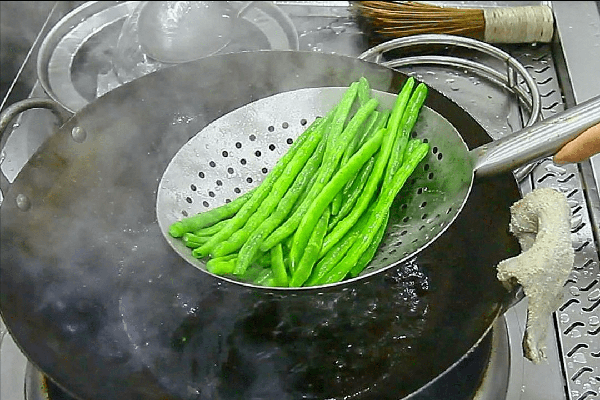 2.鍋內加水,加入食鹽和植物油,減少四季豆營養成分的流失。開大火,把水燒開以後,把四季豆下鍋,焯水3分鐘以上,四季豆變成青色,再撈出控水。