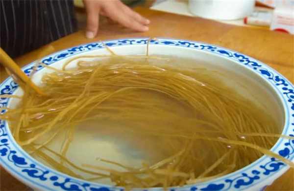 1.先準備半斤的紅薯粉條,用熱水燙一下,把粉條完全泡軟,用熱水泡10分鐘左右。