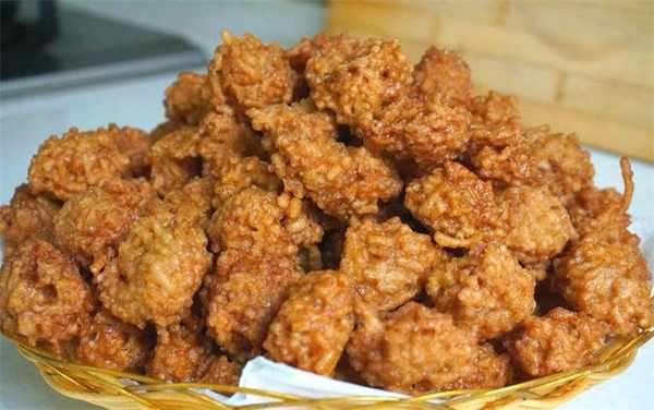 5.油溫六成熱下丸子,丸子定型之後攪一攪,炸到兩面金黃控油撈出。