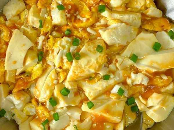 4.煮湯汁濃稠後,再倒入煎好的玉子豆腐翻炒均勻,裹上醬汁,然後撒入一把蔥花點綴,即可出鍋開吃。