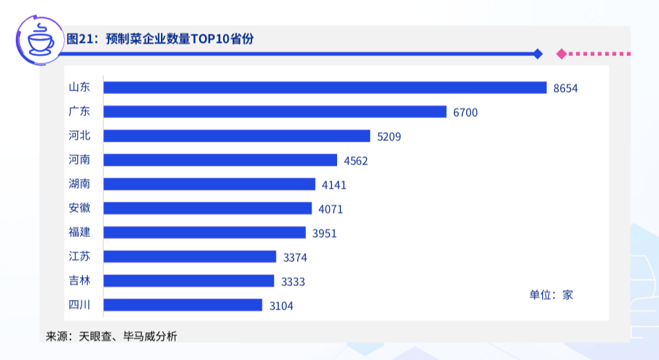 從企業分佈的情況來看,目前預制菜企業主要集中在山東、廣東、河北、河南等地,其中,山東擁有預制菜相關企業現有八千餘傢預制菜企業,占比達到12.64% 。主要原因是上述省份區域人口較多、飲食文化亦相當化濃厚,同時也具有上遊原料優勢。