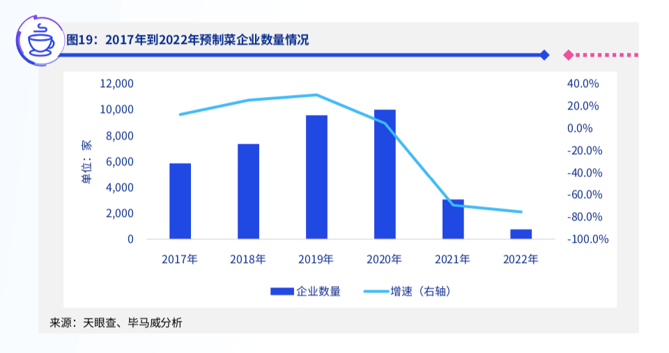 天眼查數據顯示,截至2022年12月31日,中國預制菜相關企業達6.8 萬餘傢,超過5成的企業成立於近5年間。其中,2017年到2019年期間,預制菜企業的註冊量平均增速接近23%,2020年增速開始降緩,但2020年預制菜企業註冊量在這一年達到峰值,有9997傢。此外,49.7%的預制菜企業註冊資本在200萬元以內,註冊資本在1000萬元以上的僅為前者的1/4。