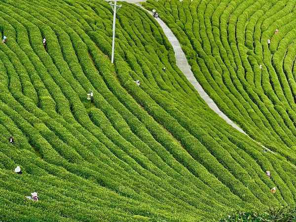 一場場春雨喚醒的茶園,披上瞭薄薄翠衣,站在茶山高處遠眺,一片清新的綠色,在雨中顯得格外美麗,使人越看越舒服,越看越喜歡。一行行一片片淡淡的嫩綠,如毯似浪的綿延起伏,煞是好看。