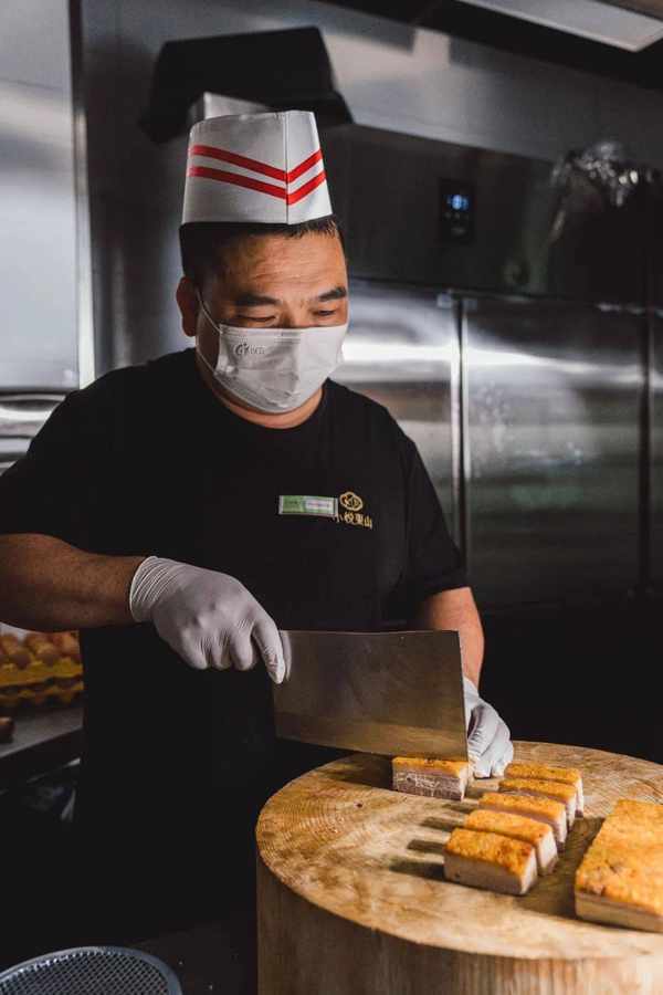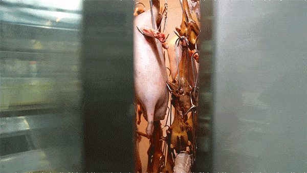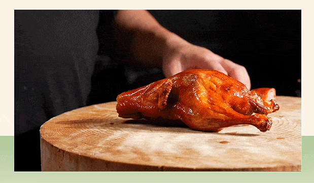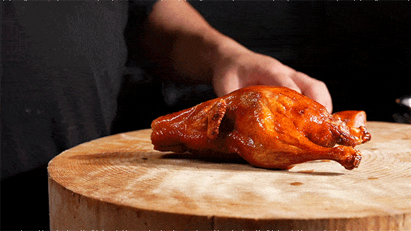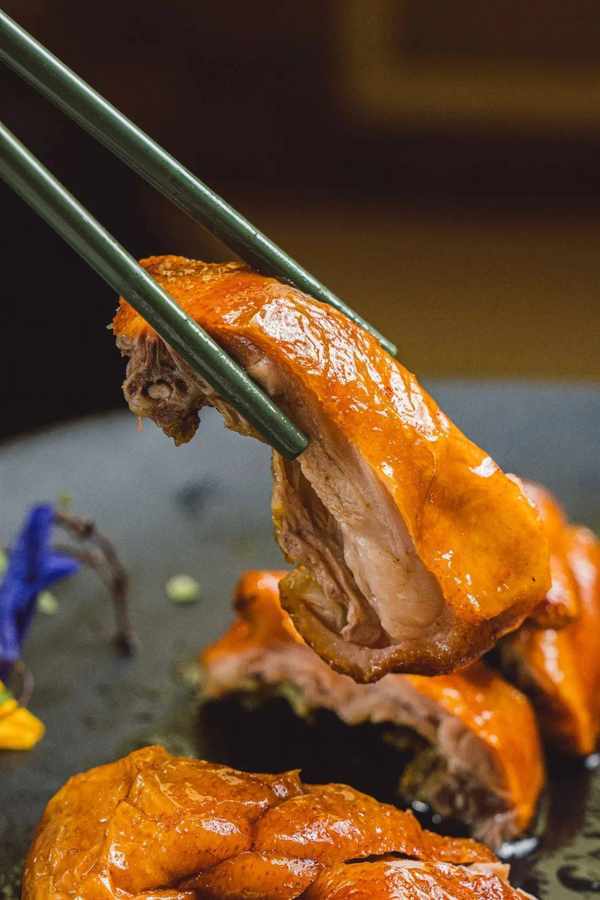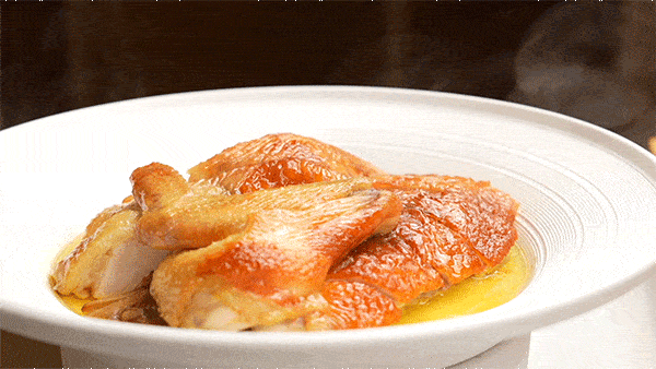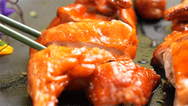 自帶“玻璃”外皮的乳鴨,內裡的肉質卻依然細嫩,皮肉之間還有一層豐富油脂。大廚手起刀落,乳鴨直接爆汁!送進嘴中時還能感受到豐盈汁水和肉質的柔軟淡香,建議趁熱吃~