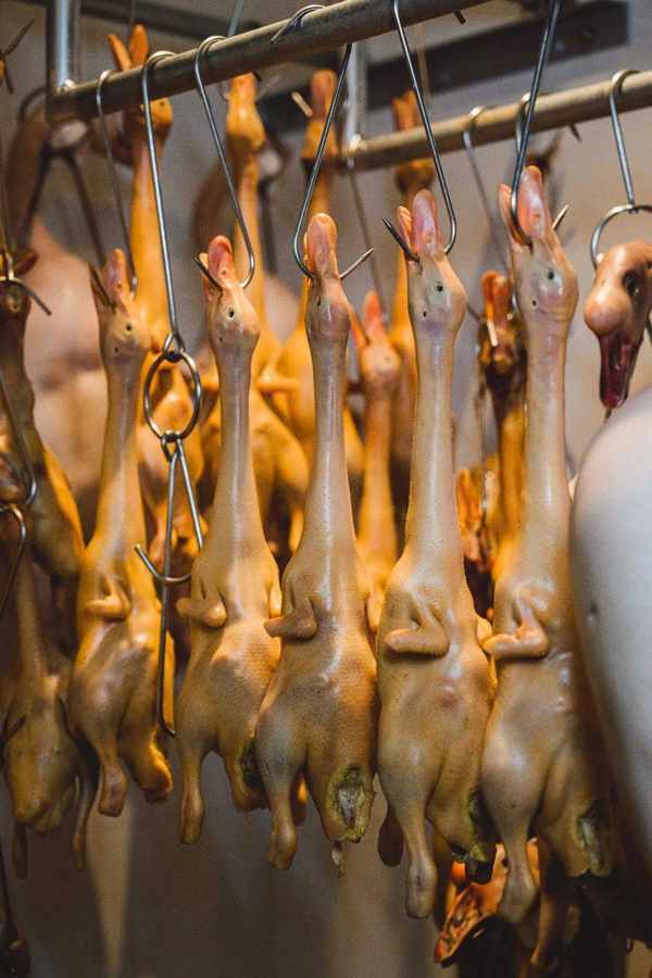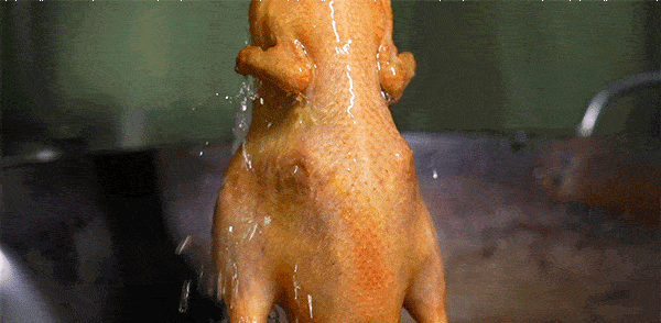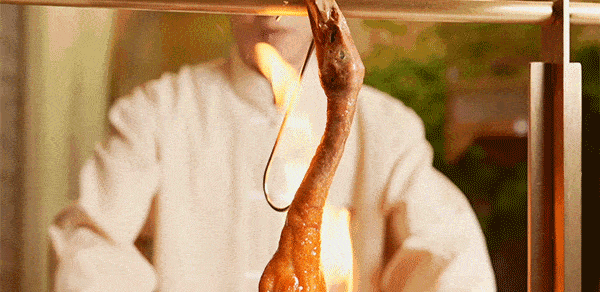 在風幹房取出自然風幹24小時的乳鴨,直接進行130℃高溫油炸。乳鴨表皮逐漸變得金黃,不誇張地說,用眼睛都能感受到焦脆。出爐後的乳鴨還得經過火焰洗禮,才算完成這次色香味的感官盛宴。