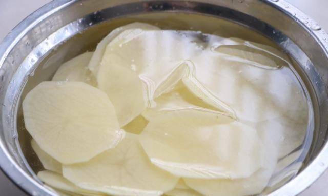 3、將切好的土豆放入清水中洗去土豆皮上的淀粉;