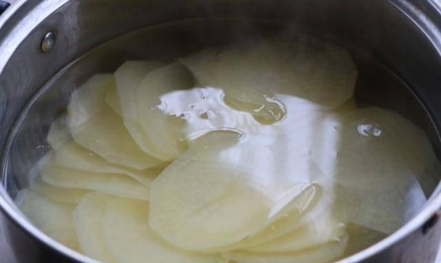 4、開水鍋中倒入足量的開水,加入1勺鹽,然後放入土豆片焯水至透明;