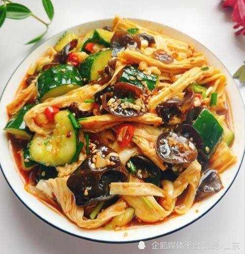 食材:黃瓜1根,腐竹2根,木耳1把,香菜2根。大蒜5個,生抽1勺,米醋1勺,油辣子1勺
