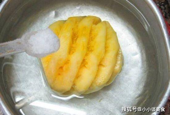 菠蘿切好後,我們將菠蘿放入碗中,碗中加入適量的水,再加入少許鹽拌勻。將菠蘿用淡鹽水浸泡一會兒,可以去除菠蘿中的部分蛋白酶,增加菠蘿的口感和甜度,口感更好,而且不傷害口腔粘膜。