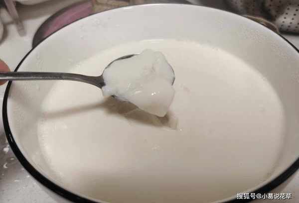 3.接下來,將準備好的內酯溶解在冷水中。待豆漿冷卻後,倒入內酯,搖勻,備用。