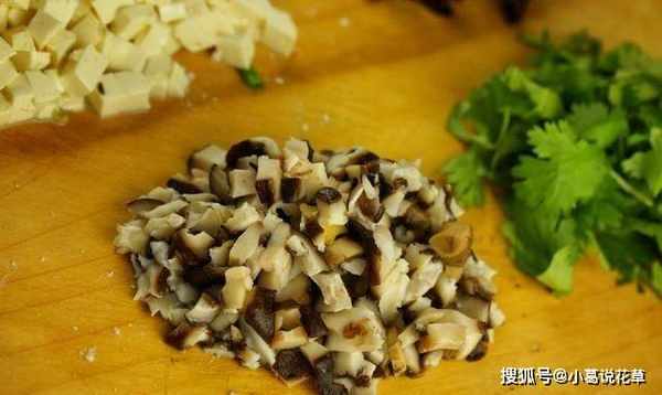 第三步:將香菇和泡發好的香菇切丁。同樣,先切成條狀,再切成小方塊備用。