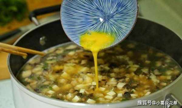 第12步:將打散的雞蛋慢慢倒入均勻,形成漂浮在湯汁中的蛋花。