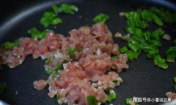第五步:平底鍋燒熱,加入一勺植物油,一勺十三香,將切好的香蔥放入油鍋中炒香,再放入肉末炒至變白碎裂。先加一勺生抽,給肉片提味。