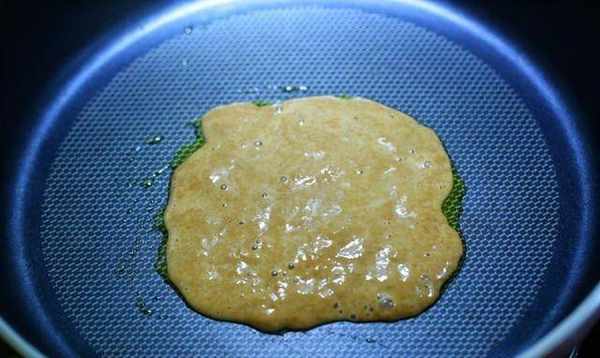 第四步:然後,用勺子或盛飯用的同一個勺子,舀一勺面團,慢慢倒入鍋中,等面團攤開成圓形。文火煎一下,聞到香味,底部熟瞭,就可以翻面瞭。