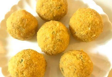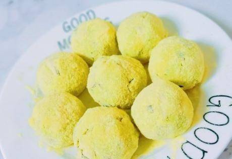 第四步,將餡料揉成大小均勻的球狀,然後取蔬菜面團,放入玉米面搟圓,均勻鋪上一層玉米面,再噴少許水,再次包緊。向上;