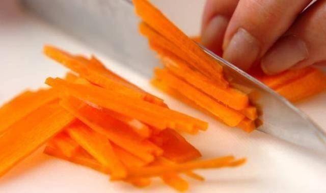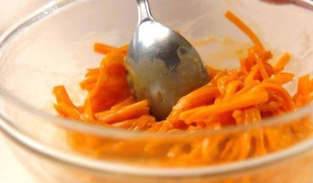 1.首先,將胡蘿卜切成細條。如果刀好,可以用手切,也可以用刨絲器搓成細條,然後加1茶匙鹽醃制。