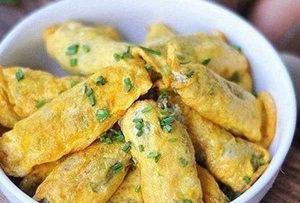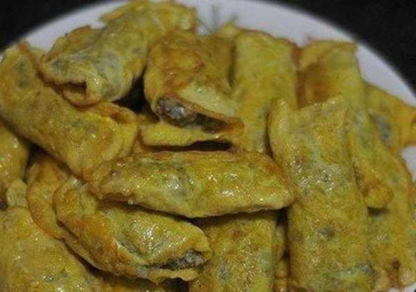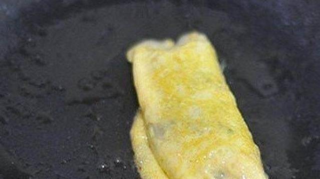 5.鍋裡放少許油,燒熱,加入一勺蛋液,立即調節控制旋鈕,關火,小心轉動鍋子,讓煎蛋的形狀更好,或者蛋液會稍微凝固。當表面有點流淌時,取一團餡料放在煎蛋的一側