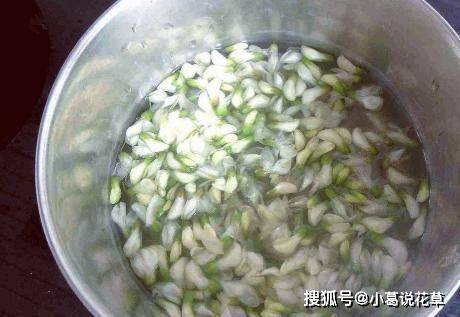 第三步,取適量槐花,洗凈,加水入鍋。水開後,放入槐花,用水焯一下。約30秒後,可撈出檢查。把裡面的水瀝幹,放在一個大碗裡;