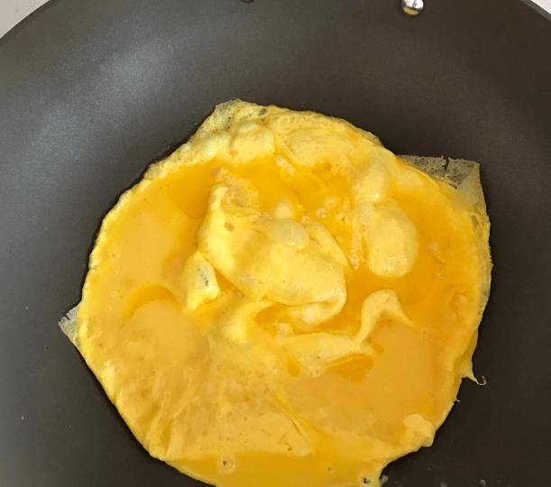 3、同時,熱鍋倒入適量食用油,將蛋液倒入鍋中煎至金黃色,盛盤待用。