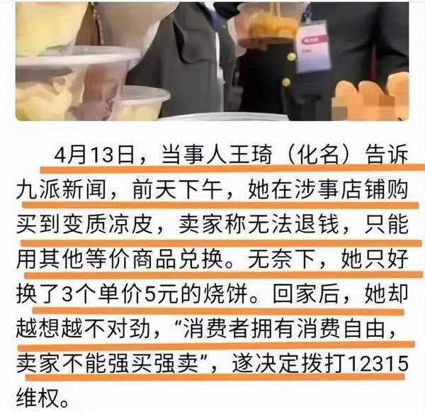 按照常理來說,如果涼皮確實有問題,那麼店傢最低的處理標準應該是退還顧客購買這份涼皮的費用,但店傢卻毫無作為。