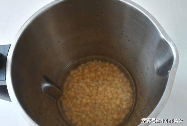 第三步:將米浸泡30分鐘。泡好後撈出瀝幹即可。這一步可以提前做好,省時間!當所有的材料都處理好後,拿出已經準備好的豆漿機,先把剝好的玉米粒倒入豆漿機,再倒入適量的水,最後把泡好的米放入豆漿機,然後按開始按鈕將玉米粒打成玉米汁!