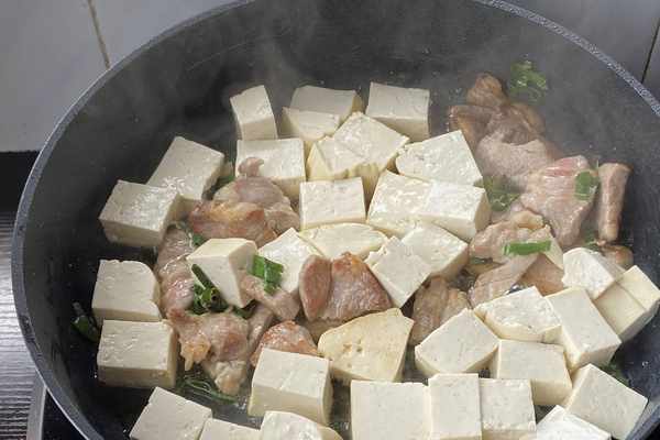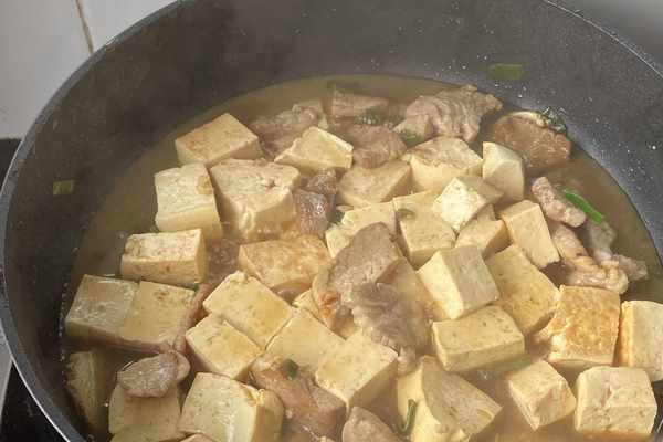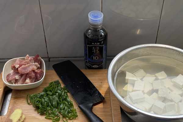 豆腐1塊、鹵肥腸2塊、豬肉100克、植物油1勺、生薑2片、蔥花少許、白胡椒粉少許、原汁醬油1勺、蠔油1勺、香油1小勺、鹽少許、白芝麻少許、高湯少許。