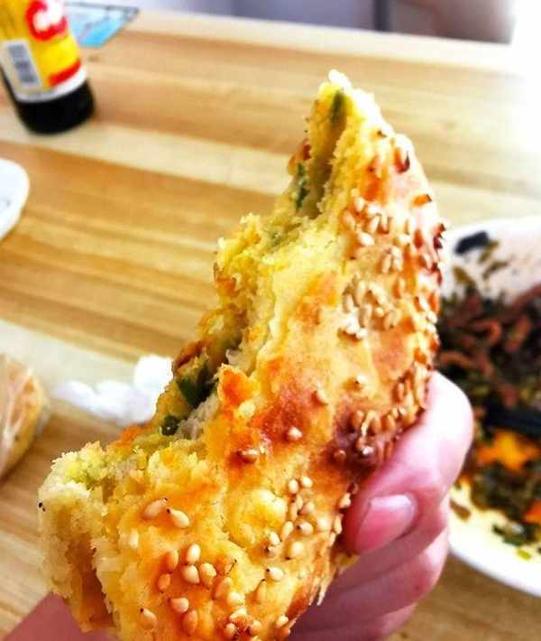 這是著名的“黃橋燒餅”,我在泰州吃到的,一條小巷子裡的一傢小店,現烤出來的燒餅,真的太好吃瞭。黃橋燒餅是江蘇省特色小吃之一,原產地是泰州泰興市黃橋鎮,所以叫黃橋燒餅。這個燒餅和北方常見的燒餅不太一樣,帶餡兒,個頭小,樣子更像那種點心“老婆餅”。