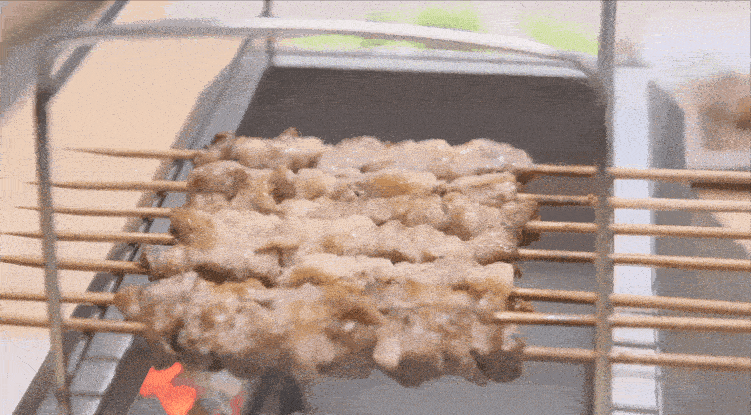 蔥花孜然點綴著烤熟的肉串