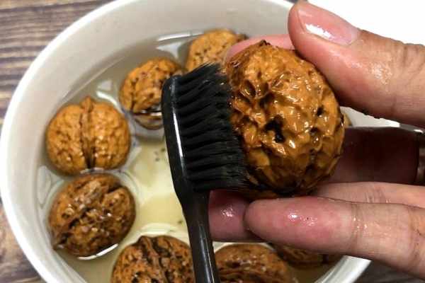 2.用刷子在核桃殼上來回刷,去掉臟東西。畢竟是用來煮水,因此是很有必要清洗幹凈一些的。